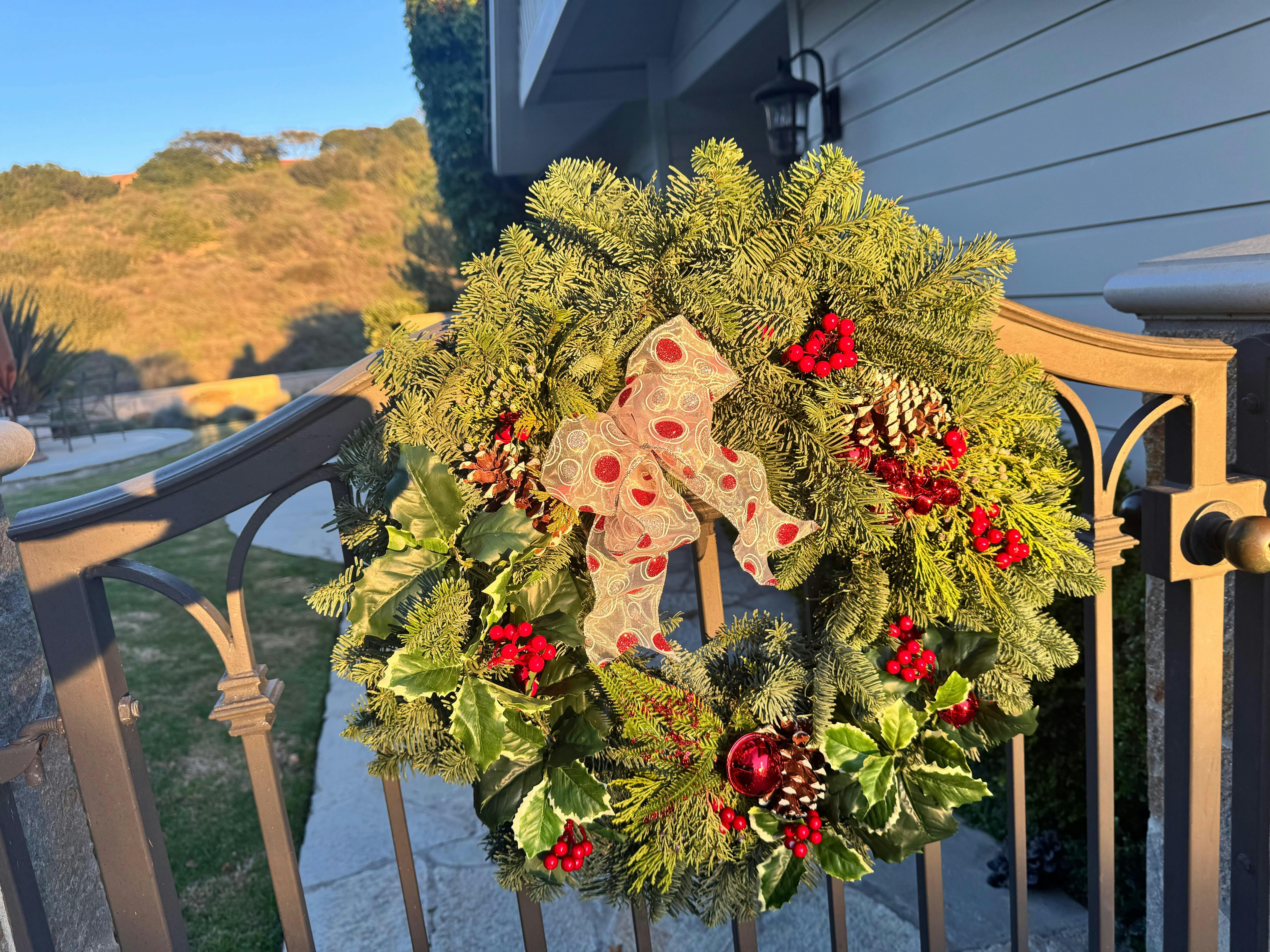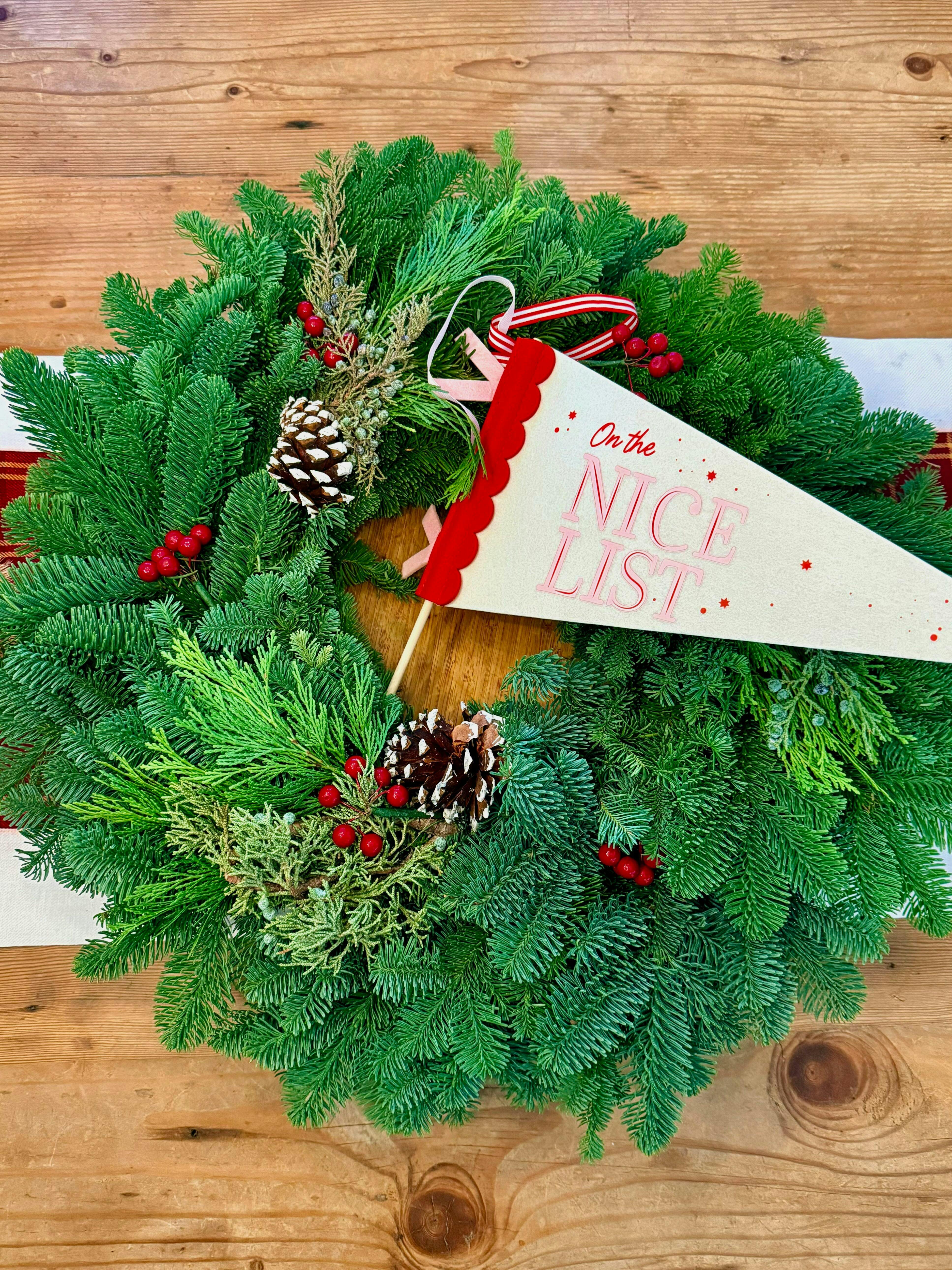 Made fresh with premium Noble Fir boughs. Accents include Incense Cedar, Blue Berried Juniper, Red Berries and Frosted Pinecones. 24" diameter. Accent features may vary. Wreaths available for pickup on Saturday, December 5th, 2026.